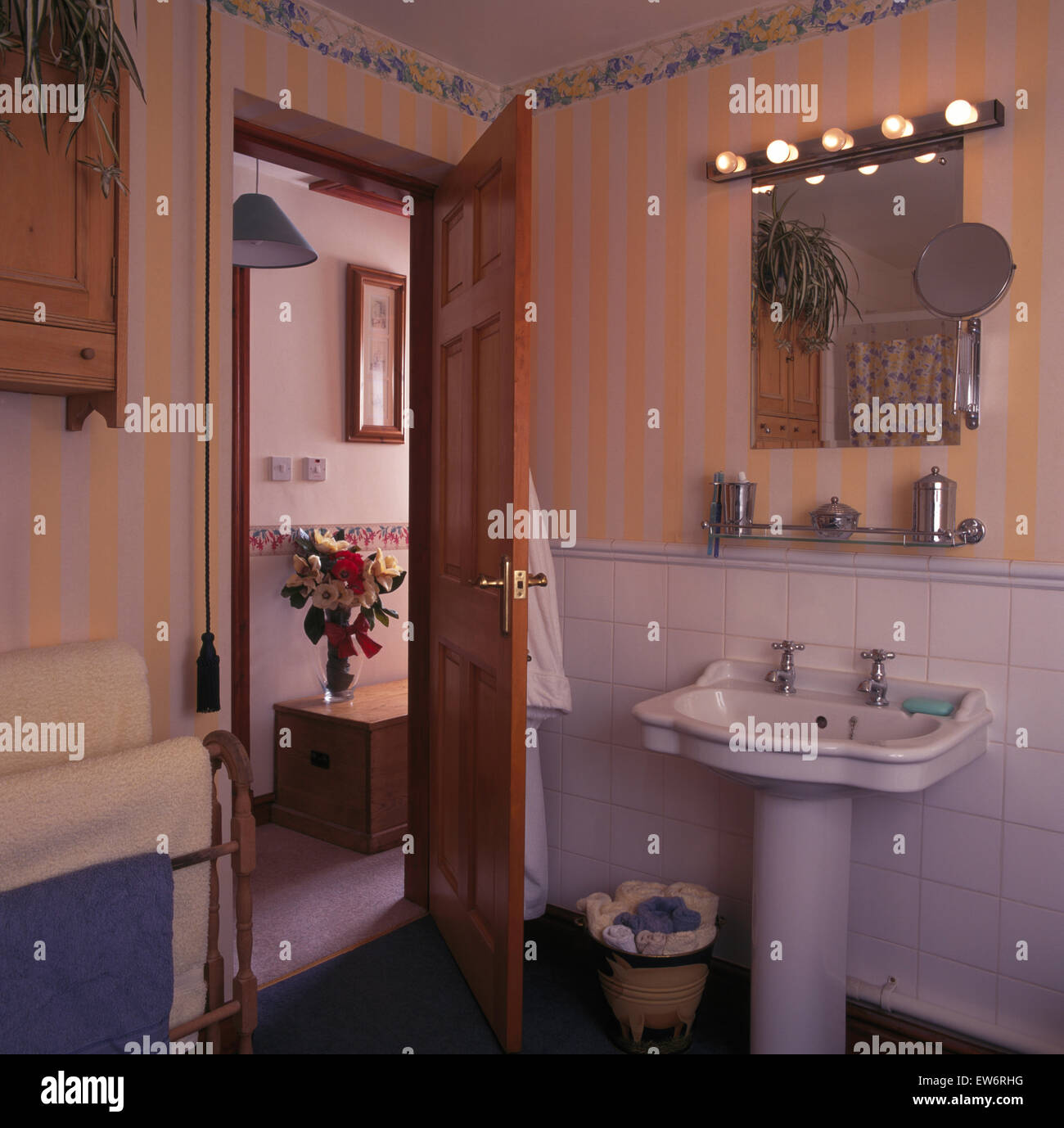 Hollywood Style Lighting On Mirror Above Pedestal Basin In