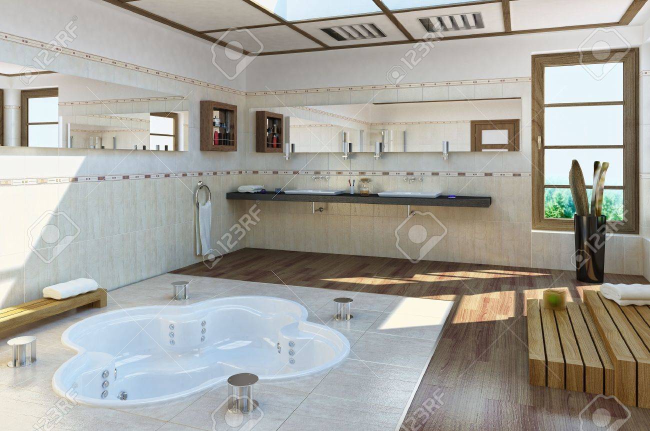 Large Luxury Bathroom With Bathub Into The Floor Stock Photo
