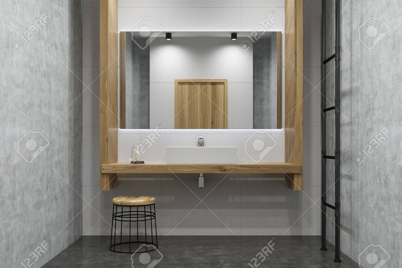 Concrete Bathroom Interior With A Wooden Shelf A Sink Standing