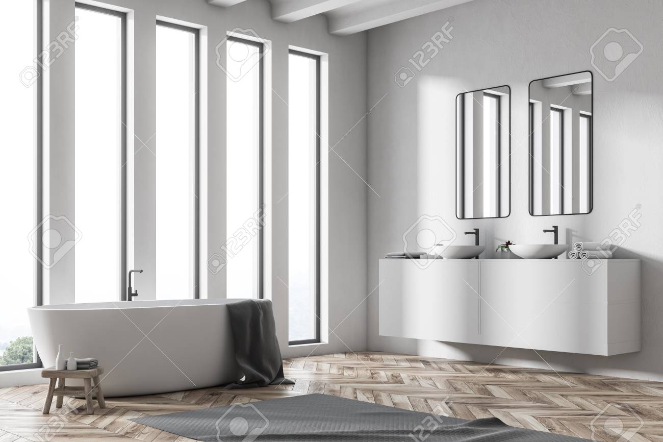 Loft White Bathroom Corner With A Wooden Floor A White Tub