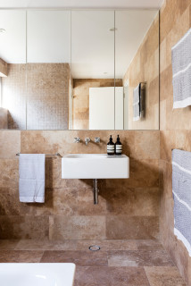 Mostaghim associates design ideas for a mid sized contemporary master bathroom in melbourne with an open shower a wall mount toilet travertine travertine floors an open shower white benchtops flat panel cabinets white cabinets beige walls a console sink and beige floor. Design ideas for a mid sized transitional 34 bathroom in minneapolis with shaker cabinets medium wood cabinets an alcove shower a two piece toilet beige tile travertine white walls travertine floors an undermount sink engineered quartz benchtops beige floor and a hinged shower door. Travertine tile for use in the bathroom is quite a contested issue and is a cause of confusion for many particularly those who are new to bathroom design.