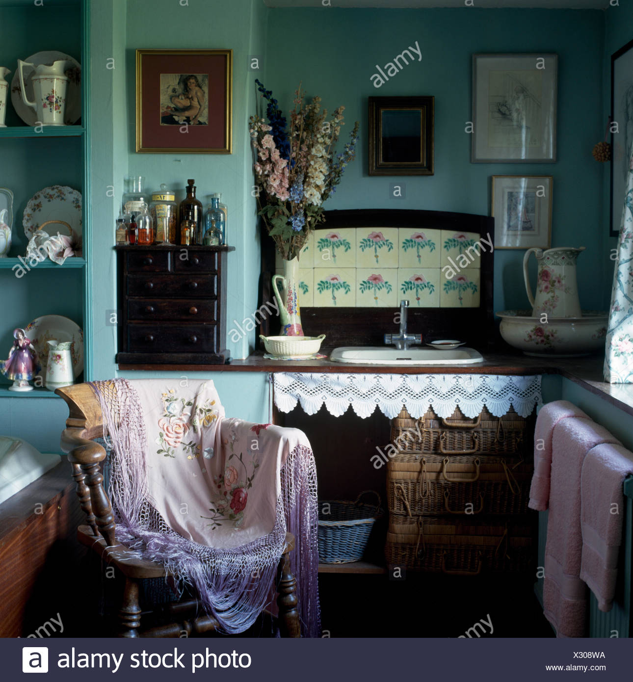 Vintage Shawl On Wooden Chair In A Pale Turquoise Victorian Style