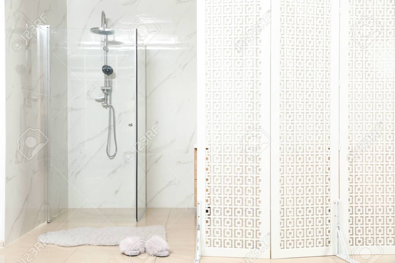 Modern Bathroom Interior With Shower Stall And Folding Screen