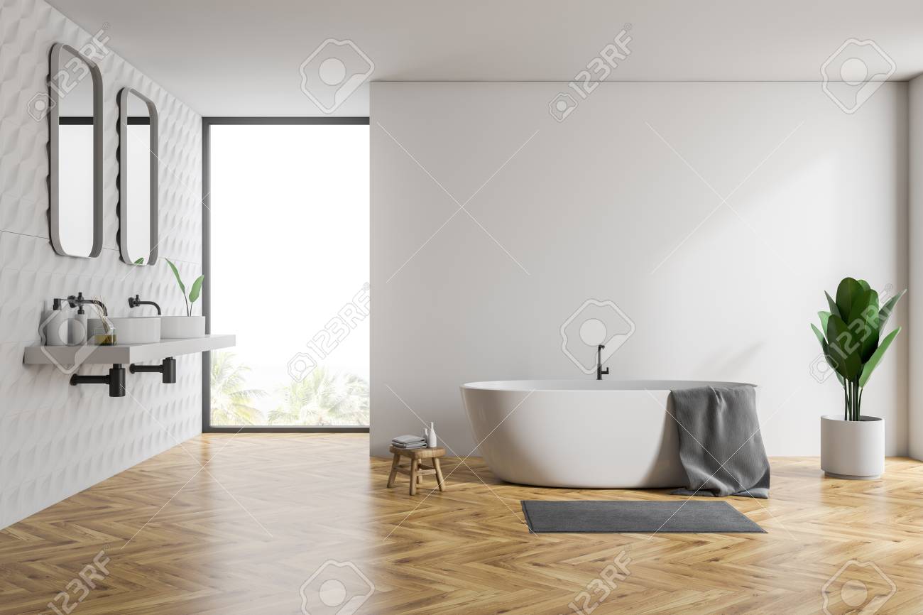 Interior Of Bathroom With White And Tiled Walls Wooden Floor