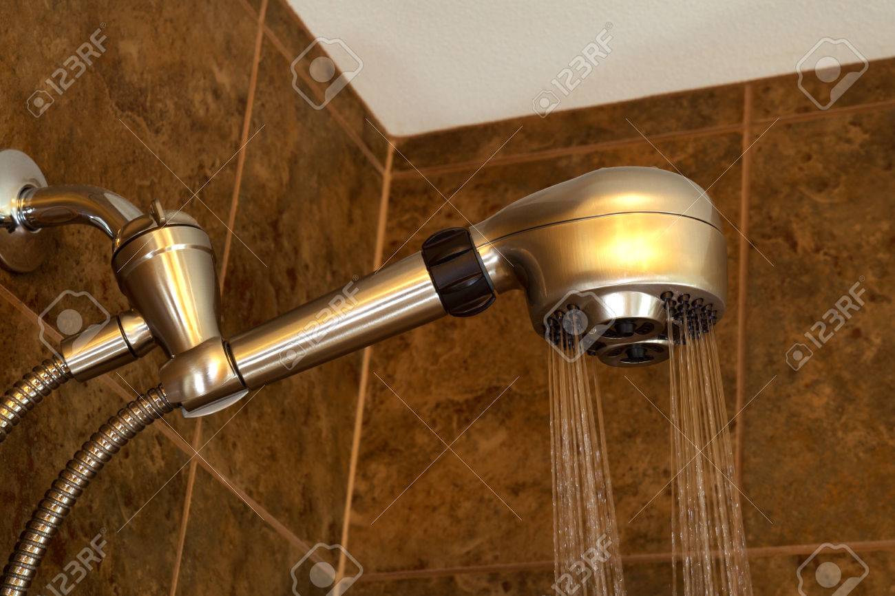 Horizontal Photo Of Running Shower Head In Master Bathroom With