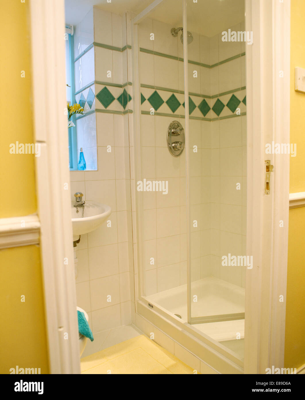 Green Diamond Tiled Border In Shower With Folding Glass Door In