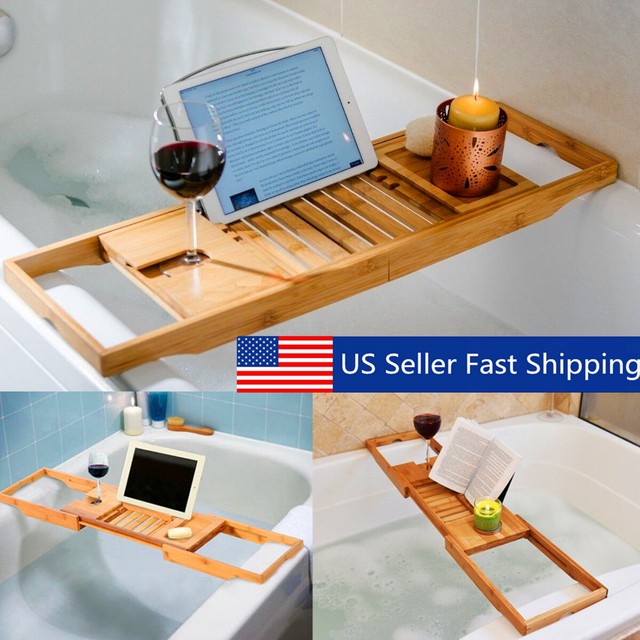 Wooden Bamboo Bath Tray Food Serving Bathtub Caddy Book Holder