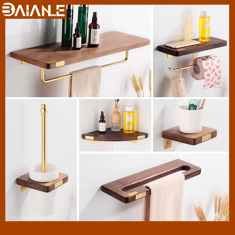 Bathroom Towel Holder Brass Wood Bathroom Shelf Shower Storage