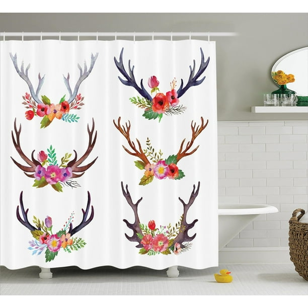 Antlers Decor Shower Curtain Set Deer Horns Bouquet Flowers Bloom