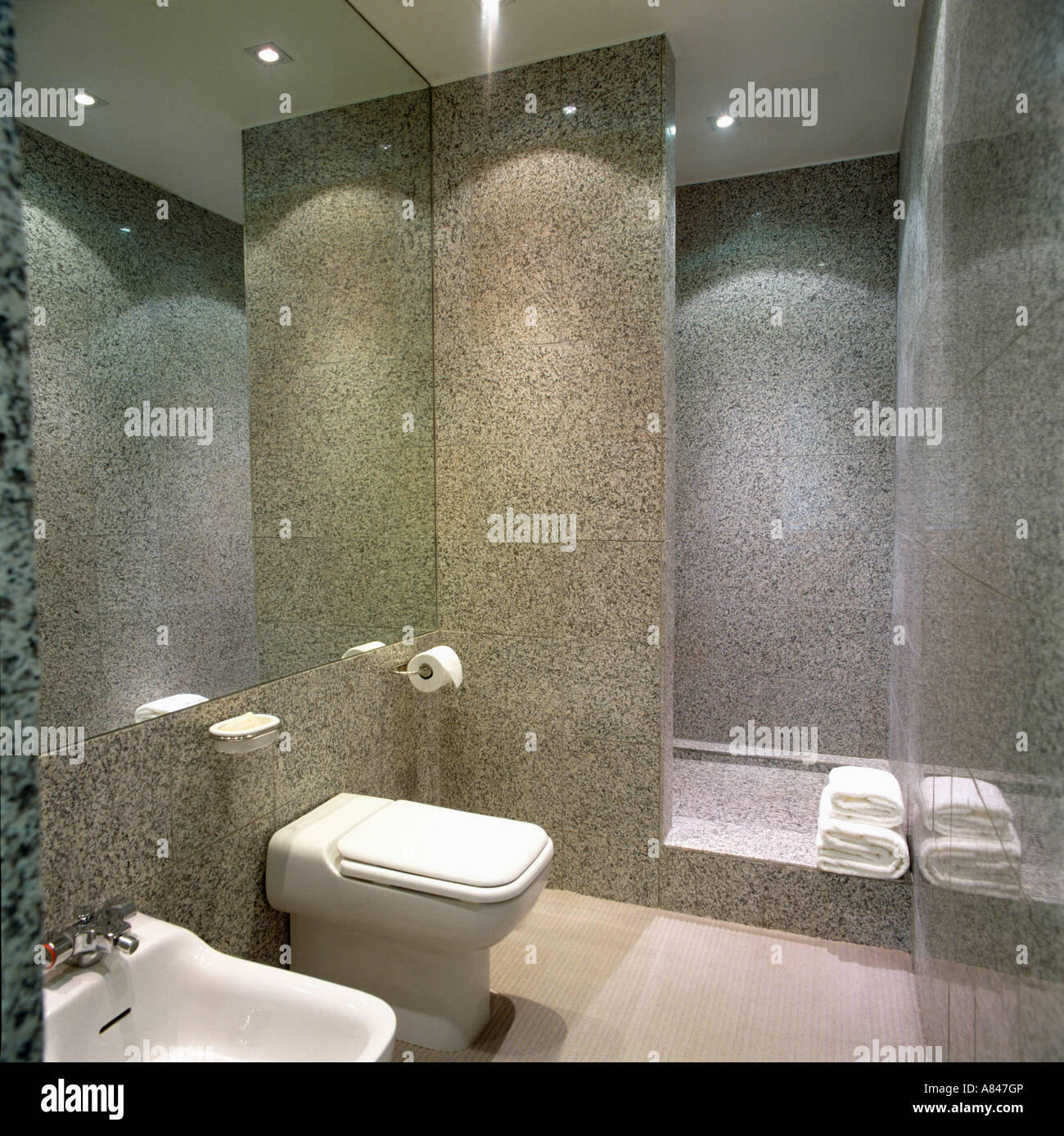 Modern Bathroom With Polished Granite Walls And Large Mirror Stock