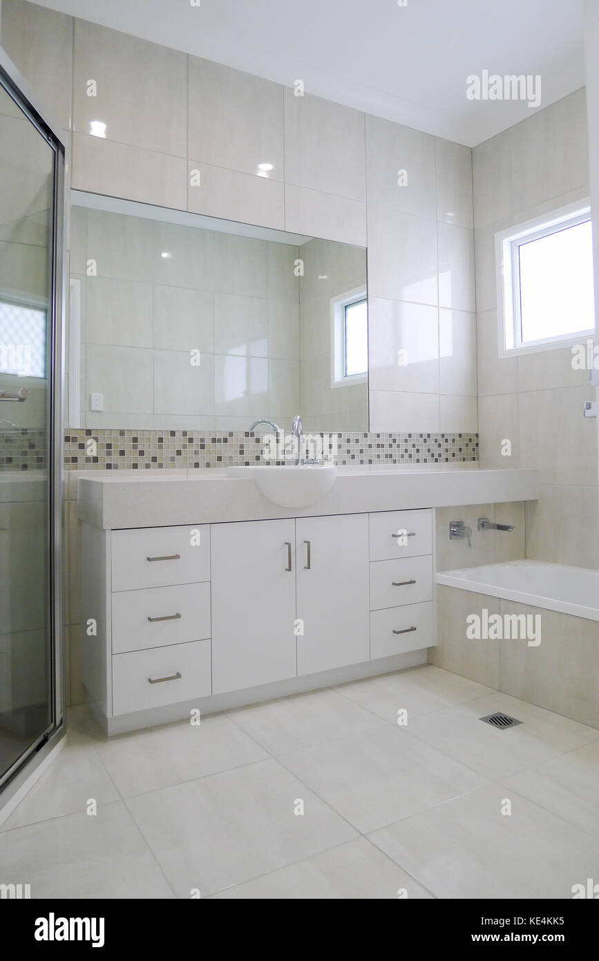 Granite Bench Top In Bathroom With Tiled Walls And Floors Stock