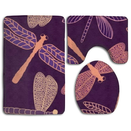 Erehome Purple Dragonfly 3 Piece Bathroom Rugs Set Bath Rug
