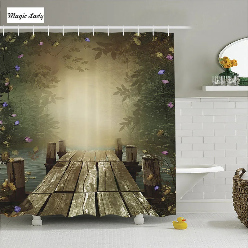 Shower Curtain Wood Bathroom Accessories Bridge Pier Pond River