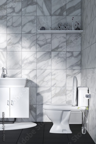 Corner Of Modern Bathroom With White Marble Walls Black Marble