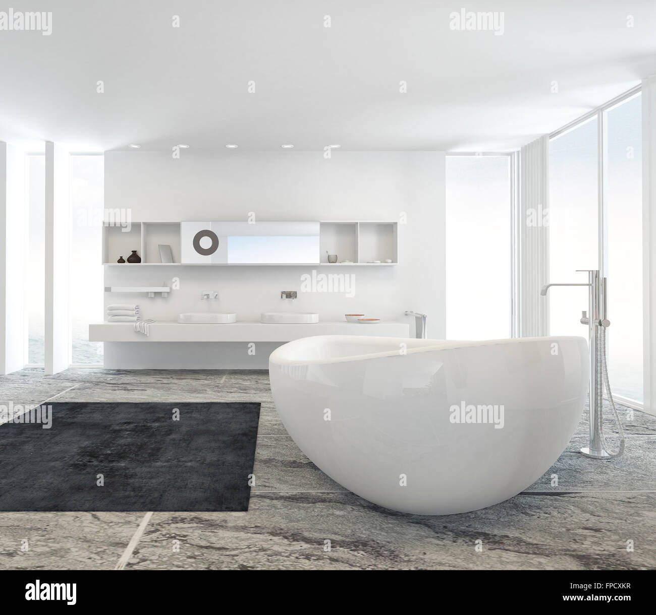 Modern Bathroom Interior With A Freestanding White Tub On A Marble